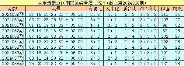 开奖回顾:体彩大乐透第24068期开出奖号为:15 20 31 32 33+05 10,前区大小比为4:1,012路比为2:1:2,质合比为1:4,奇偶比为3:2,后区大小比为1:1,012路比为0:1:1,质合比为1:1,奇偶比为1:1。