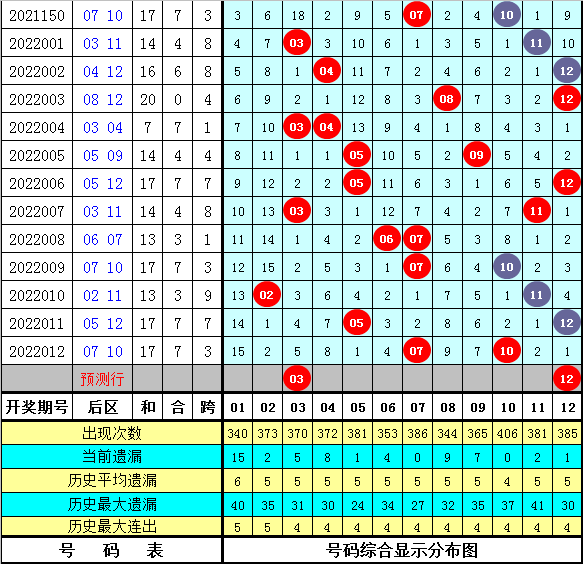 后区分析:最近7周星期三全大出现4期,全小出现0期,一大一小出现3期;全奇出现1期,全偶出现1期,一奇一偶出现5期,本期后区两码参考03和12。