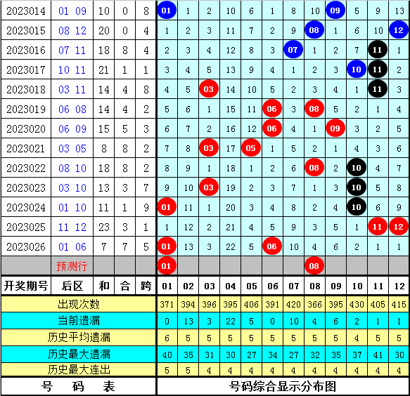 前区温码分析:最近100期前区遗漏5-12期的温码奖号出现155个,温码开出比例为31%,最近50期开出75个温码奖号,温码出现比例为30%,前10期温码出现16个,目前前区遗漏5-12期的号码有11个,近期防温码逐渐轮空,本期注意温码:05、12、16、18。