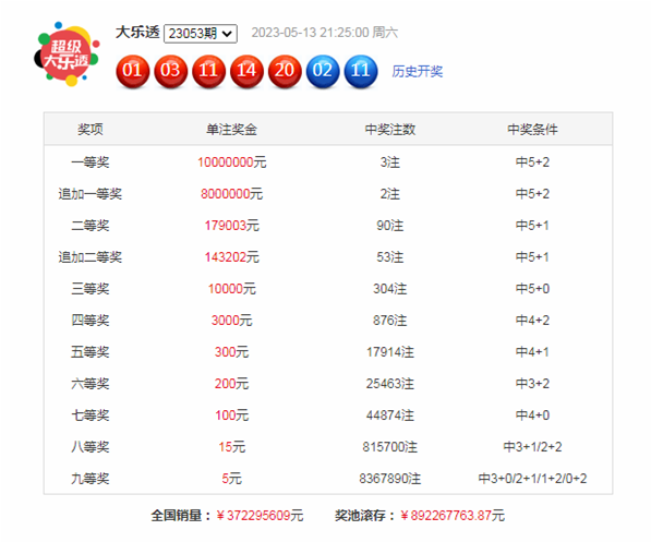 大乐透第2023053期奖号为:01、03、11、14、20+02、11。其中前区冷热比为2:3,开出1枚重号:11,三区比为3:2:0,没有出现连码,后区为全2路奖号。