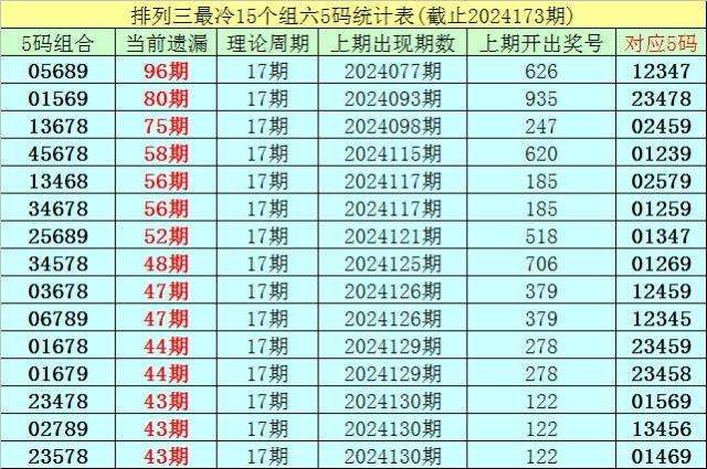 (5)排列三目前遗漏值最大的5码组六组合为:05689,本期遗漏96期,短期解冻的可能性较小,则24174期奖号分布在05689-12347之中的可能性最大。