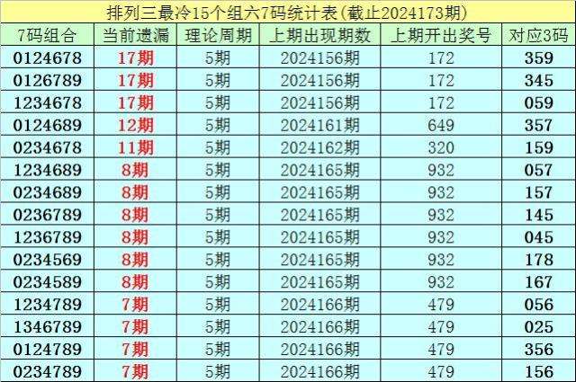 (2)在排列三第2024173期奖号中,最冷的7码组六遗漏17期,在这17期奖号中,组六号码开出12期,出现概率为71%,半顺组合开出8期,不含全顺组合,开出概率为47%;杂六组合开出4期,开出概率为24%。