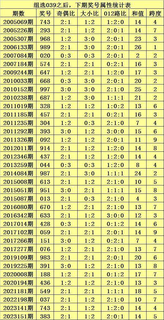 二、组选039分析:排列三历史上已开出38次组选号码039了,其奖号和下期开出奖号统计如下:
