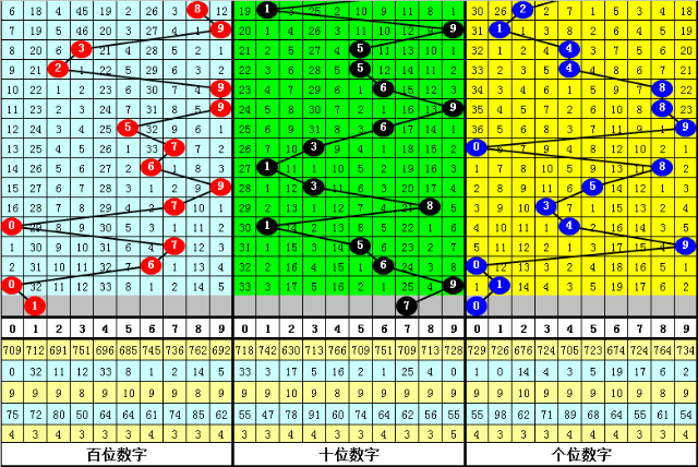 十位上期奖号为:温号9,最近十位主要为热号、温号,冷号开出次数相对较低,该位本期有4个冷号没有解冻:0、2、4、7,本期重点防止该位冷号解冻,参考冷号7。