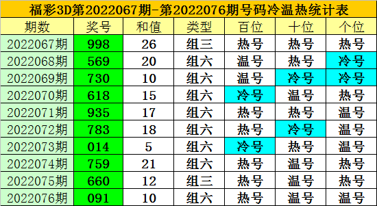 上期回顾:福彩3D第2022076期开奖奖号为:091,奖号类型为:组六,奖号冷温热态为:热号+温号+温号。