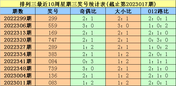 排列三第2023011期(上周星期三)奖号为083。其中奖号奇偶比为1:2,大小比为1:2,012路比为2:0:1。
