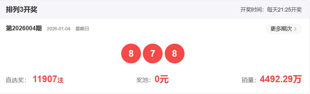 排列三第2026004期开奖回顾:开奖号码:878 形态:组三