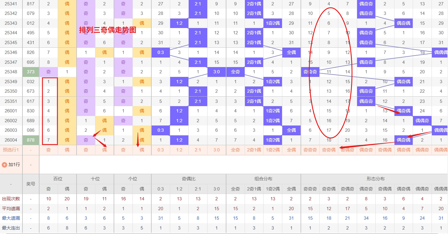 排列三 奇偶分析:从上图可以看出排列三100期内百位奇偶比约为45比55,十位奇偶比为51比49,个位奇偶比为54比46,十位的比值比较均衡,但是百位的比值偏差就有点大,历史奇偶形态近2期开出偶奇偶后下一期的走势为,第287期开出偶奇偶后288期开奇偶奇, 第294期开出偶奇偶后第295期开奇奇偶,第306期开出偶奇偶后第307期开偶偶奇,近期排列三的奇偶形态走势观察,呈现出明显的冷热分化格局。偶偶奇形态目前热度极高,已进入强势周期,其出号节奏紧凑,历史数据也显示该形态具备较强的连续性,因此短期内偶偶奇连下的可能性非常大,是当前需要重点防守的核心形态。与此同时,奇偶奇形态则陷入深度冷态,遗漏期数较长,但按照概率均衡与冷极转热的规律,其反弹回补的潜在风险正在累积,不能完全忽视。所以排列三2026005期奇偶形态推奇偶奇与偶偶奇。本文由彩虹多多钱是生命动力所著,请勿转载