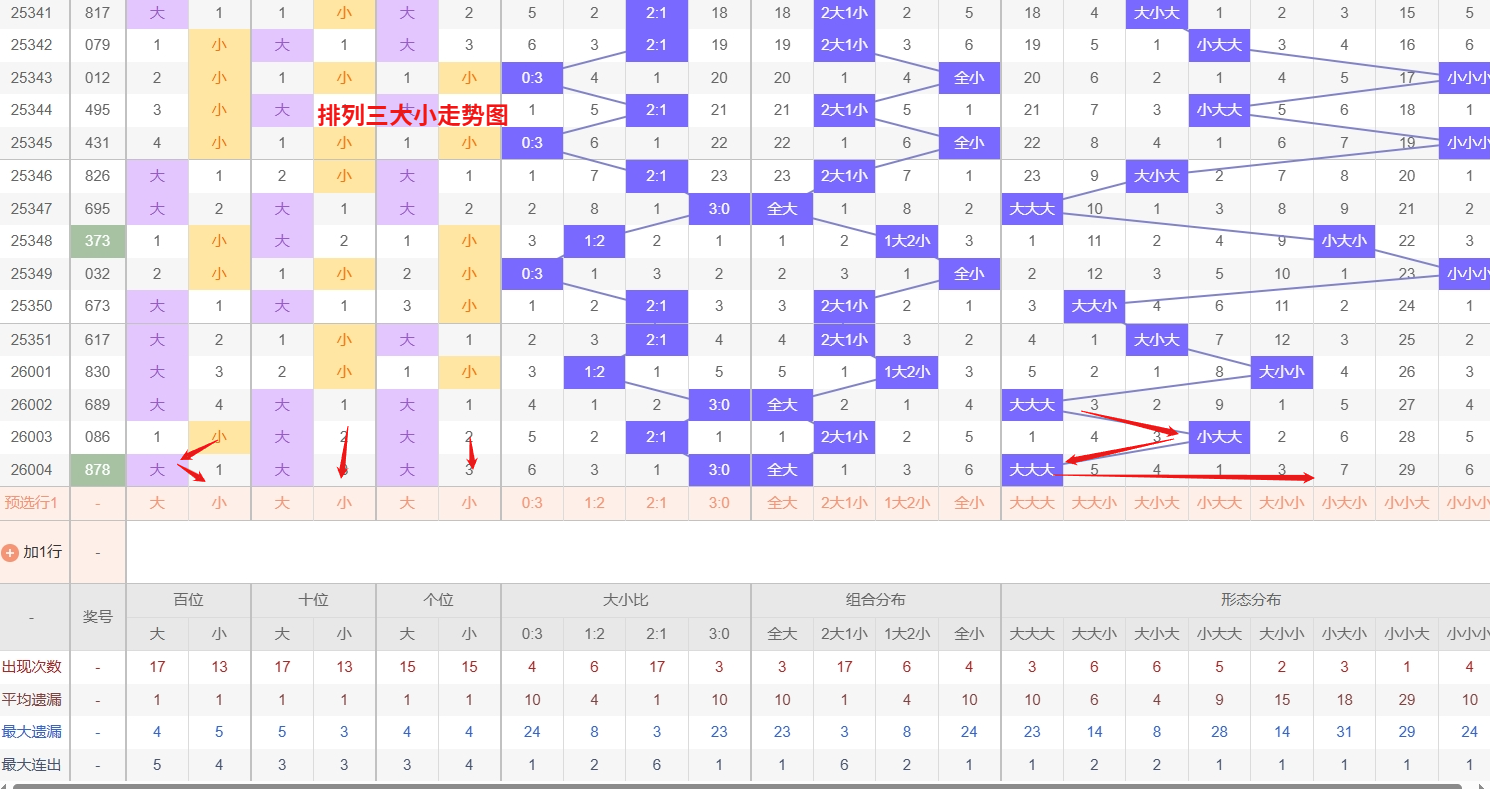 排列三 大小形态分析:从大小走势图上可以看出排列三100期内百位大小比约为55比45,十位大小比约为48:52,个位大小比约为54比46,除了个位和百位奇数比偶数多,十位偶数比奇数多。历史数据近2期开出大大大下一期的走势为,第284期开出大大大第285期开小大小。第292期开出大大大后第293期开小小大,第304期开出大大大后305期开大大小。近期排列三大小形态走势来看,小小大形态已遗漏多期,持续处于深度冷态,按照冷态平衡规律,其理论回补压力正在逐步增大,需密切关注其解冻信号,具备随时反弹的可能性。与此同时,小大小形态近期表现虽未达到热态,但出号频率趋于稳定,间隔周期呈现缩短趋势,有明显的由温转热迹象,同样值得防范。以排列三第2026005期大小形态推荐小大小防小小大。本文由彩虹多多钱是生命动力所著,请勿转载