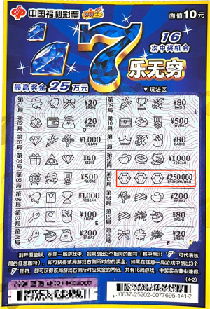 在众多彩票游戏中,“刮刮乐”即开票以其即买即刮、即中即兑、玩法多样、趣味性强等特点,一直深受购彩者喜爱。其中“7乐无穷”刮刮乐即开票以“7”为主题,略带动感的数字“7”与金灿灿的钻石构成了快乐的音符,让整个彩票显得光彩夺目。“7乐无穷”这一名称取自同音成语“其乐无穷”,玩法简单,为彩民朋友送上无限的欢乐与惊喜!