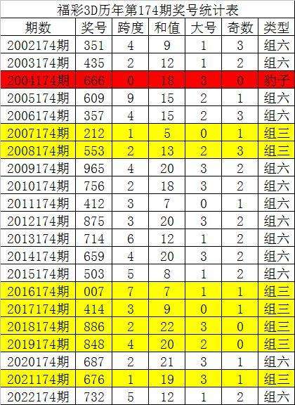 福彩3D历年第174期同期分别开出奖号:351、435、666、609、357、212、553、965、756、412、875、714、659、503、007、414、886、848、687、676、732,详细统计见下表: