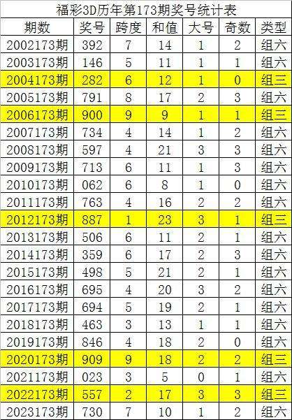 从以上统计可以看出,历年3D第174期开出了1次豹子号码,开出了7次组三号码,开出了13次组六号码。组三号码和组六号码基本相当,本期预计开出组六号码。