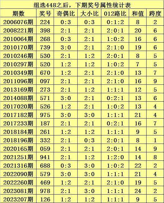 二、组选448分析:排列三历史上已开出23次组选号码448了,其奖号和下期开出奖号统计如下: