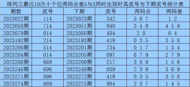 从以上统计可以看出,十个位两码合差5与3同时出现之后其下期两码合差表现最热的4个分别为:1359,本期十个位两码合差可以参考这四码中的数据。