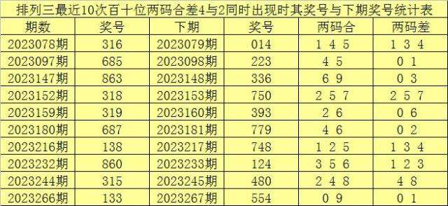 百十位合差分析:上期奖号百十位开出31组合,两码合为4,两码差为2,最近10次百十位两码合4与两码差2同时出现时,其奖号和下期奖号分别为: