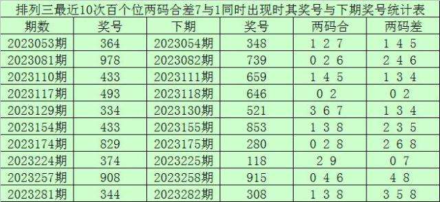 百个位合差分析:上期奖号百个位开出34组合,两码合为7,两码差为1,最近10次百个位两码合7与两码差1同时出现时,其奖号和下期奖号分别为: