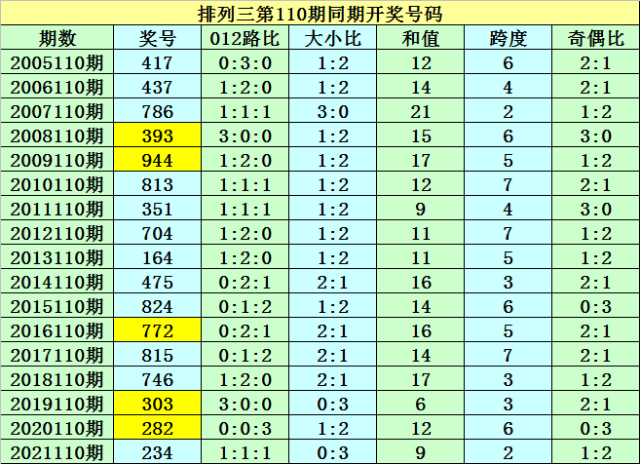 排列三从2004年开奖至今已开出6179期奖号了,其中第110期历史同期奖号出现17次,历年第110期分别开出号码:417、437、786、393、944、813、351、704、164、475、824、772、815、746、303、282、234。