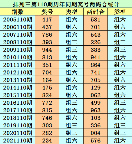 在历年同期中两码合开出年限分别为:1、4、6出现6年,0、3出现5年,5、7、9出现4年,2、8出现3年,第2022110期预计两码合出现:1、6、7。