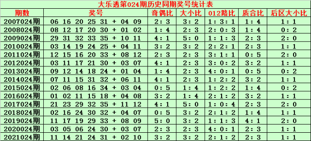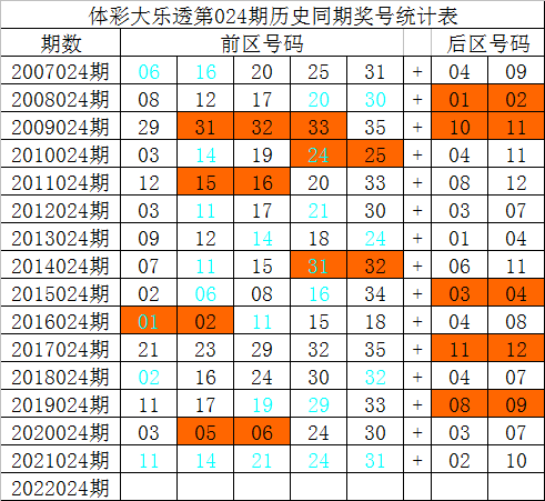 体彩大乐透第024期历史上已开出了15次,其奖号分别为: