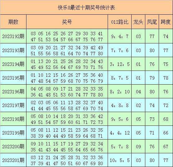 快乐8第2023201期奖号为:03 12 21 24 25 28 31 32 33 36 37 39 41 47 50 51 60 67 69 80,其中奖号012路比为10:5:5,跨度为77。