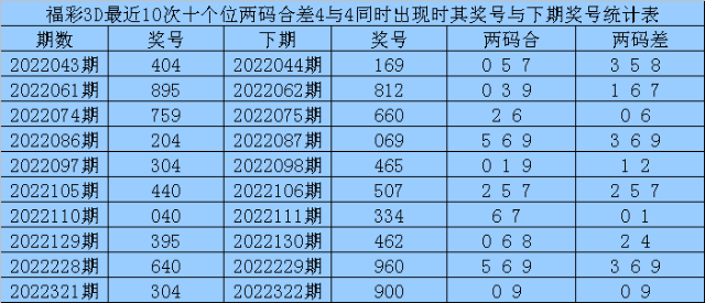 十个位合差分析:上期奖号十个位开出59组合,两码合为4,两码差为4,最近10次十个位两码合4与两码差4同时出现时,其奖号和下期奖号分别为: