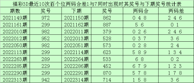 百个位合差分析:上期奖号百个位开出29组合,两码合为1,两码差为7,最近10次百个位两码合1与两码差7同时出现时,其奖号和下期奖号分别为: