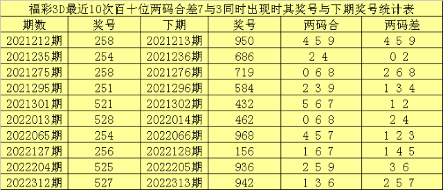 百十位合差分析:上期奖号百十位开出25组合,两码合为7,两码差为3,最近10次百十位两码合7与两码差3同时出现时,其奖号和下期奖号分别为:
