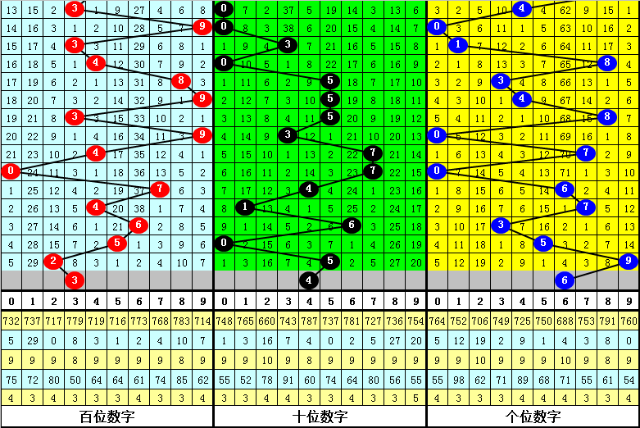 从以上统计可以看出,百十位两码合差7与3同时出现之后其下期两码合差表现最热的4个分别为:1245,本期百十位两码合差可以参考这四码中的数据。