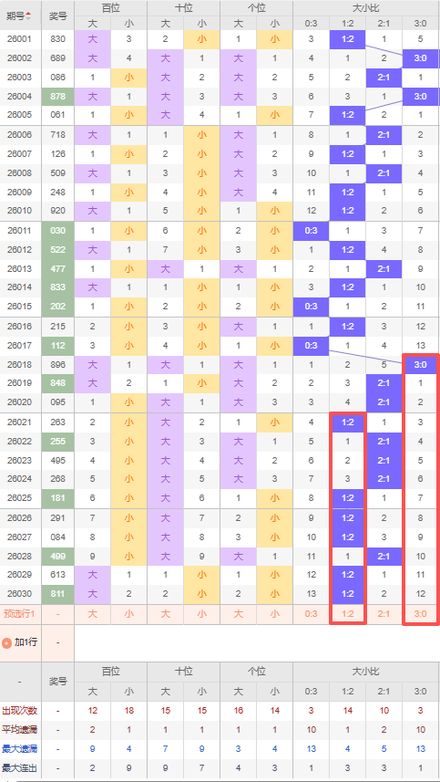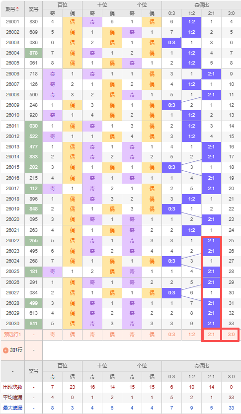 上期奇偶比:2:1,近10期奇偶比出现情况:1:2、2:1、2:1、0:3、2:1、2:1、0:3、2:1、2:1、2:1,最近10期出现7期2:1,出现1期1:2,出现2期0:3,出现0期3:0,根据近10期出号规律本期推荐遗漏33期出3:0,防四连出2:1,综上所述奇偶比推荐:防:2:1,重点关注:3:0。