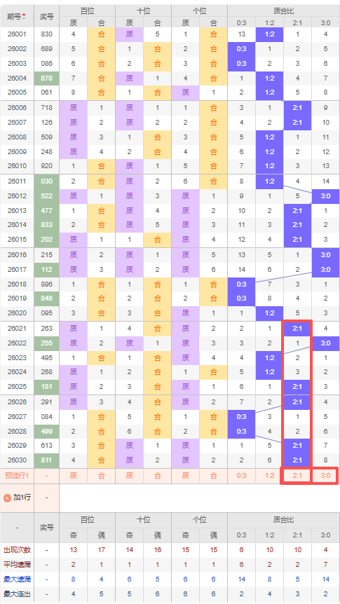 上期质合比:2:1,近10期质合比出现情况:2:1、3:0、1:2、1:2、2:1、2:1、0:3、0:3、2:1、2:1,最近10期出现5期2:1,出现2期1:2,出现2期0:3,出现1期3:0,根据近10期规律本期推荐遗漏8期出3:0,防三连出2:1,综上所述质合比推荐:防:2:1,重点关注:3:0。