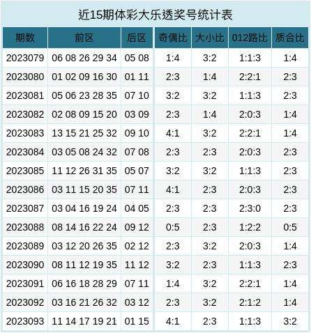 其中前区奇偶比为4:1,大小比为2:3,012路比为1:1:3,质合比为3:2。