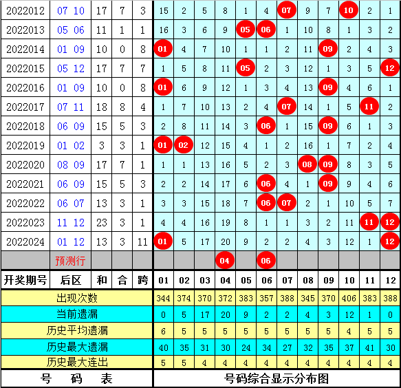 上期后区开出号码:01+12,一大一小组合、一奇一偶组合、2路号断档。本期后区看好全偶组合,关注两码04、06。
