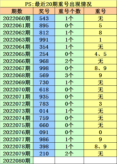 最近100期开奖中,含有重号的奖号有50期,最近20期含有重号的奖号有10期,最近10期含有重号的奖号有4期。本期注意重号落号。