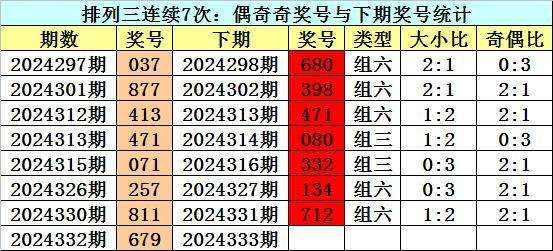 奇偶判断:上期排列三奖号为679,奇偶为:偶奇奇,近7次出现奇偶:偶奇奇奖号分别为:037-877-413-471-071-257-811。
