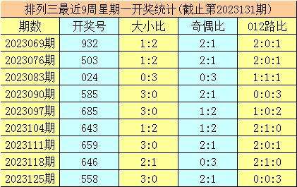 三、体彩排列三前9周星期一奖号分别开出:932-503-024-585-685-643-659-646-558,其中号码012路比为12:3:12,奇偶比为12:15,大小比为17:10;