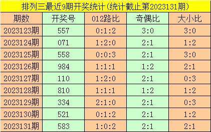 二、体彩排列三前9期奖号开出:557-071-558-984-110-810-334-521-583,其中奖号大小比为13:14,012路比为7:9:11,奇偶比为17:10;