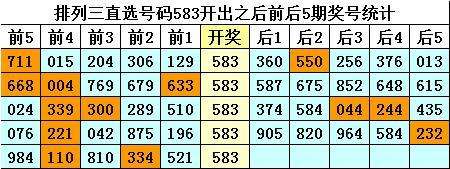 四、排列三直选号码583历史上开出5次,其前后五期奖号分别为: