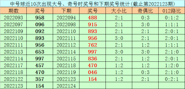 在中号球前10次开出大号、奇号类型之后,其下期分别开出奖号:488、915、893、956、762、997、836、470、046、154,其中号码012路比为4:3:3,奇偶比为7:3,大小比为7:3。