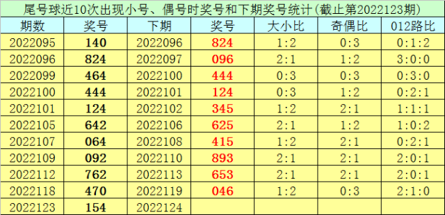 在尾号球前10次开出小号、偶号类型之后,其下期分别开出奖号:824、096、444、124、345、625、415、893、653、046,其中号码012路比为4:3:3,奇偶比为5:5,大小比为5:5。