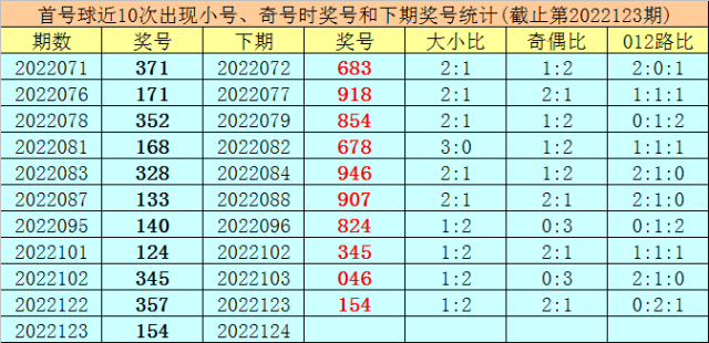 在首号球前10次开出小号、奇号类型之后,其下期分别开出奖号:683、918、854、678、946、907、824、345、046、154,其中号码奇偶比为5:5,大小比为7:3,012路比为7:1:2。