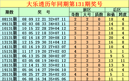 后区和值分析:历史同期奖号中,后区和值奇偶比为6:8,基本相当,本期预计和值为奇数,参考17。
