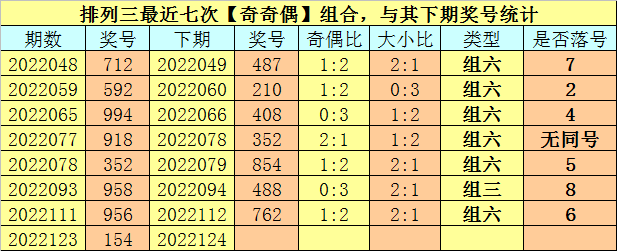 奇偶分析:排列三上期奖号为154,其奇偶类型为【奇奇偶】,最近七次出现奇偶类型奇奇偶的号码分别为:712、592、994、918、352、958、956,其下期奖号分别为:712、592、994、918、352、958、956。其中号码奇偶比为6:15,偶数奖号走势相对较活跃,近期不看好偶数走冷,本期预计再次出现2个偶数奖号。