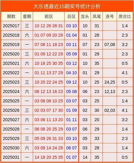 开奖回顾:大乐透第2025031期奖号:14、18、20、25、35+01、07。其中龙头为14,凤尾为35,质合比为0:5,无连号。