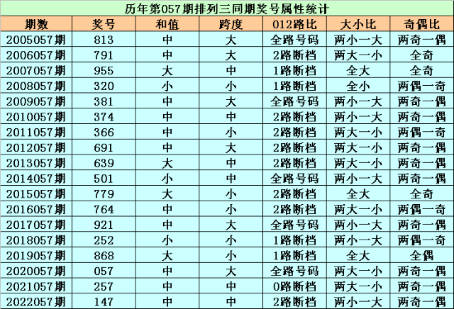 历史上第2023057期排列三已开出18期奖号了,历年同期奖号分别为:813、791、955、320、381、374、366、691、639、501、779、764、921、252、868、057、257、147,详细统计见下表:
