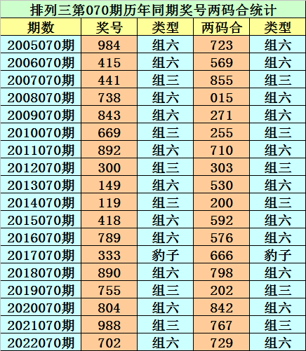 在历年同期中两码合开出年限分别为:2出现8年,5、7出现7年,0出现6年,6、9出现4年,1、3、8出现3年,4出现1年,第2023070期预计两码合出现:4、7、9。