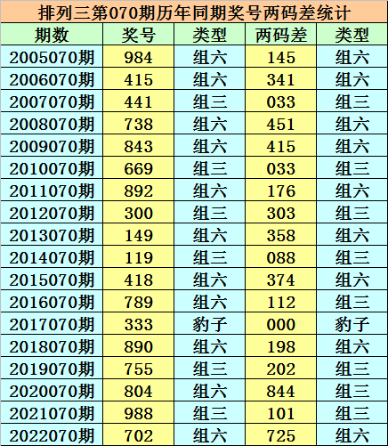 在历年开奖中,两码差开出年限分别为:1出现8年,0出现7年,3、4出现6年,5出现5年,8出现4年,2、7出现3年,6、9出现1年,第2023070期预计两码差出现:2、5、7。