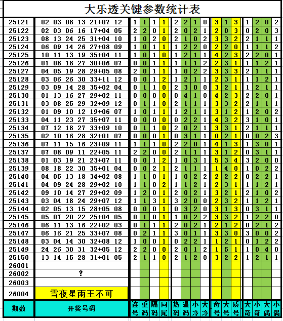 以下是作者手工统计的大乐透关键参数统计表,对喜欢参数分析、过滤缩水、选号胆杀的技术性大乐透爱好者有所帮助,其它读者可略过不看。