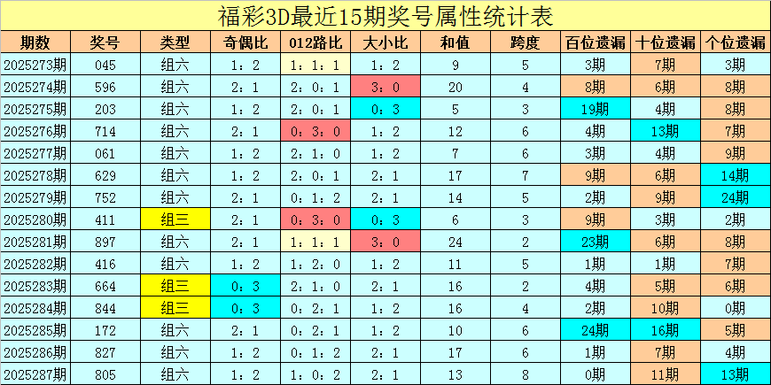 福彩3D第2025287期奖号为805,奖号组选类型为:组六,012路比为1:0:2,奇偶比为1:2,大小比为2:1,和值开出13,跨度开出8。