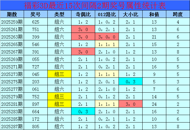 组选类型判断:最近15期奖号组三开出3次,与理论次数基本相当,组六开出12次,开出次数与理论相当,本期预计奖号为组六号码。
