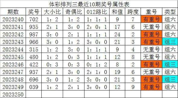 体彩排列三最近10期分别开出奖号:702、935、987、966、315、480、422、937、696、039,各奖号属性详见下表: